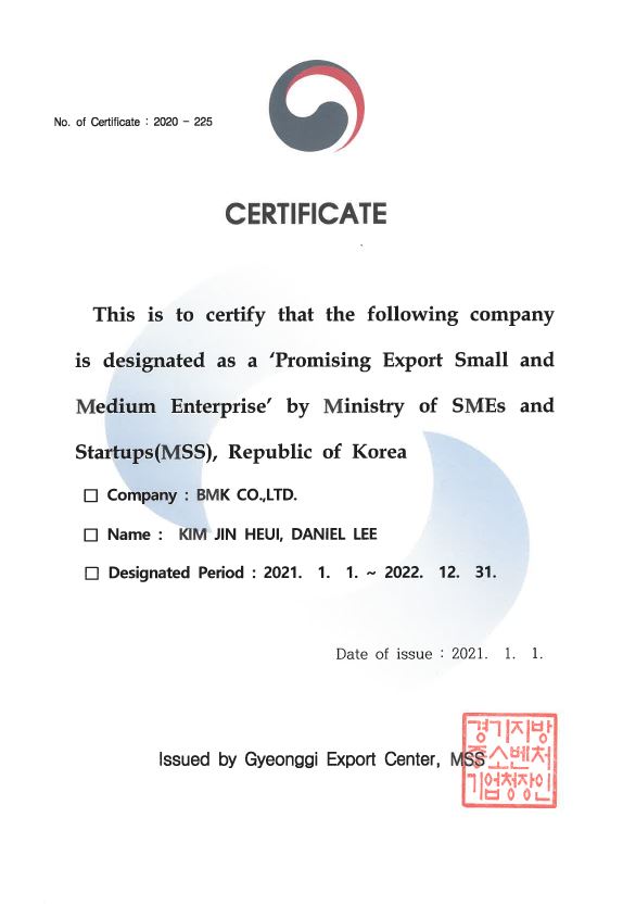 Promising Export Small and Medium Enterprise 페이지 정보 작성자 비엠케이 작성일21-01-22 10:56 조회3,079회 관련링크 이전글 다음글 목록 본문 'Promising Export Small and Medium Enterprise' by Ministry of SMEs and Startups(MSS), Republic of Korea 이전글 다음글 목록